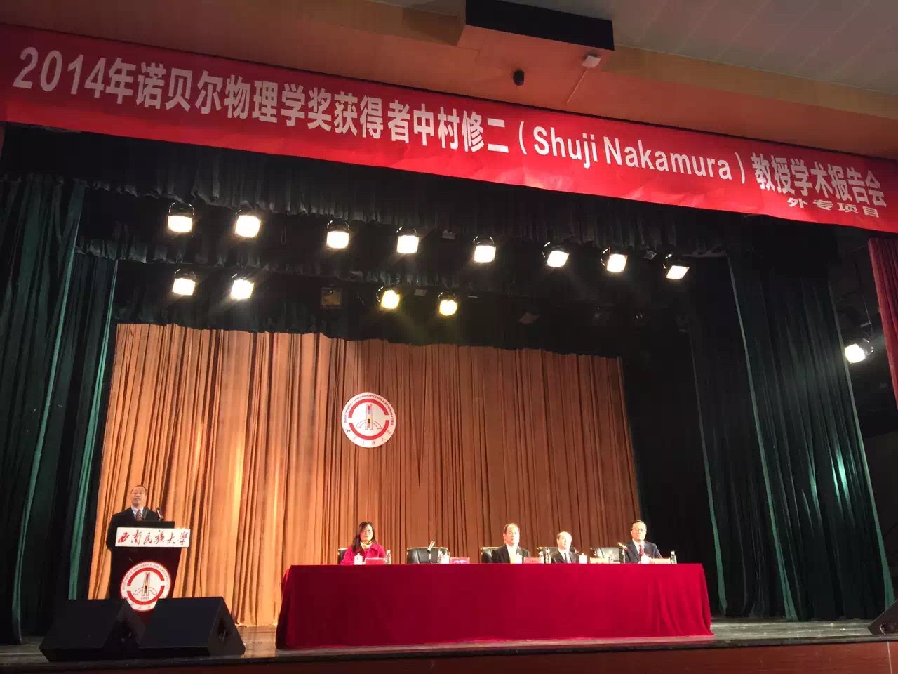 3月1日上午10:00,2014年诺贝尔物理学奖获得者、美籍日裔科学家、美国加州大学圣塔芭芭拉分校教授中村修二(Shuji Nakamura)走进西南民族大学,为各族师生作了一场精彩的讲座——《LED照亮21世纪》。作为国家外专项目重要活动之一,中村修二(Shuji Nakamura)教授为我们分享了他发明蓝光LED及获得诺贝尔物理学奖的科学探索之路。报告会由西南民族大学党委常委、副校长丁克毅教授主持。西南民族大学党委副书记、校长曾明教授,校长助理、国际交流与合作处处长李耿年同志,电气信息工程学院院长黄勤珍教授等学校相关部门领导出席了此次活动。
