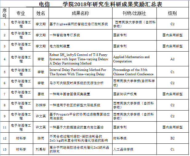2018年电信学院研究生科研成果奖励的公示 日期:2018-05-14 点击量: 经研究生申请,学院审核,李文翔等7名同学的13项科研成果符合2018年研究生科研成果奖励的申请条件,现公示如下,公示期为2018年5月11日至2017年5月17日,如有异议,欢迎向电信学院反映。电话:85522085。 电气信息工程学院 2018年5月11日 下一条:西南民族大学电气信息工程学院2018年复试考生综合成绩排名总名单(一志愿) 【关闭】